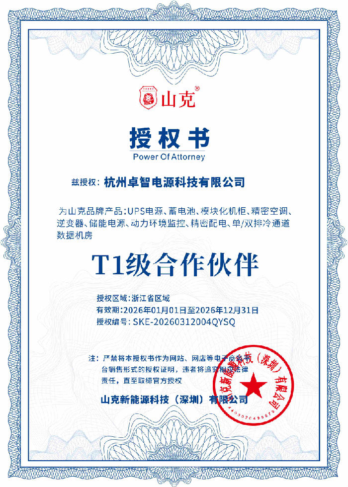 2026年杭州卓智电源与山克新能源签约,成为山克在浙江区域总代理商,产品包括:UPS电源、蓄电池、模块化机柜、精密空调、逆变器、储能电源、冷通道数据机房等产品。